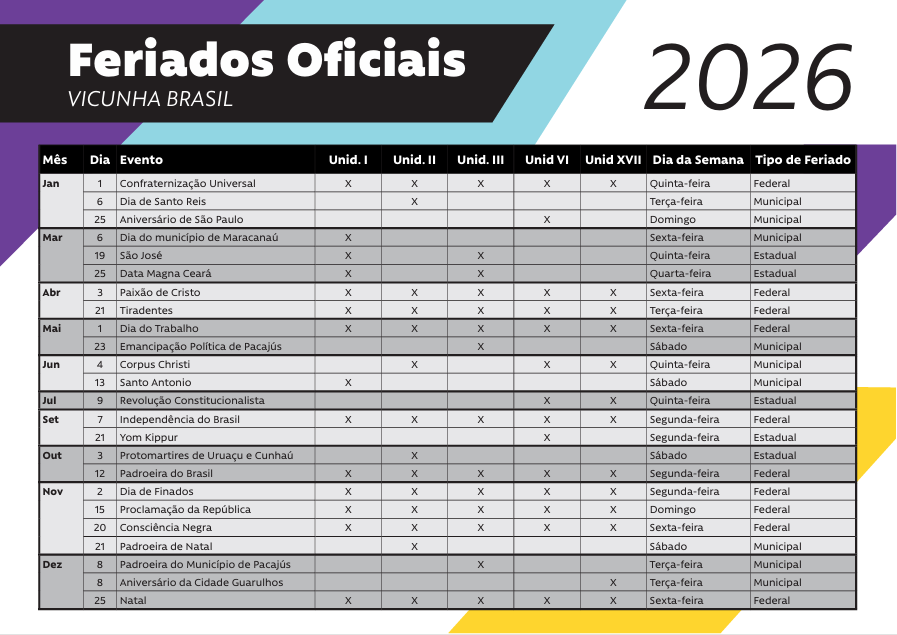 Calendário Vicunha 2026 – Feriados oficiais