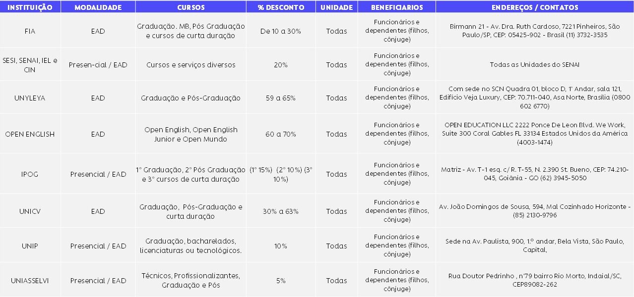 Funcionários das unidades fabris e unidades de São Paulo que tiverem interesse e buscam ainda mais conhecimento, podem entrar em contato diretamente com as nossas instituições parceiras para obter descontos e outras condições especiais.