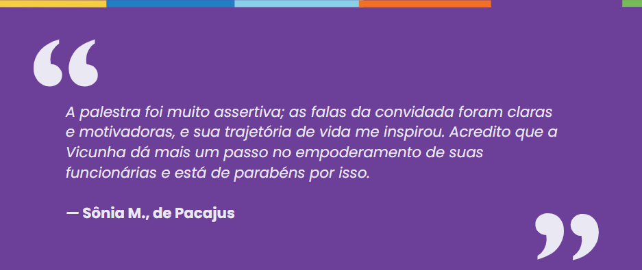 Durante a live do Dia Internacional da Mulher, a Vicunha lançou o Elas em Movimento — nosso programa interno de mentoria feminina, que tem como objetivo desenvolver competências técnicas e comportamentais das nossas funcionárias.