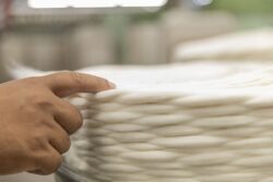 Tudo começa com a abertura dos fardos de algodão, onde a matéria-prima passa por uma limpeza e homogeneização. Aqui, existem dois tipos de limpeza: