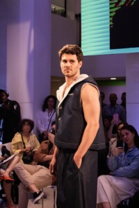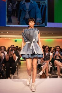 Nas fotos abaixo, os modelos vestem looks confeccionados com tecidos Vicunha lançados em 2023.