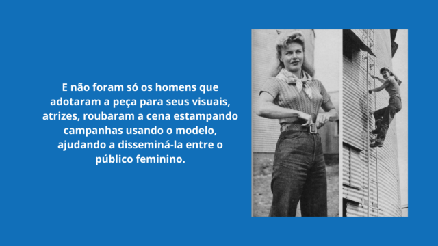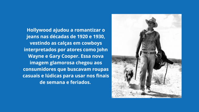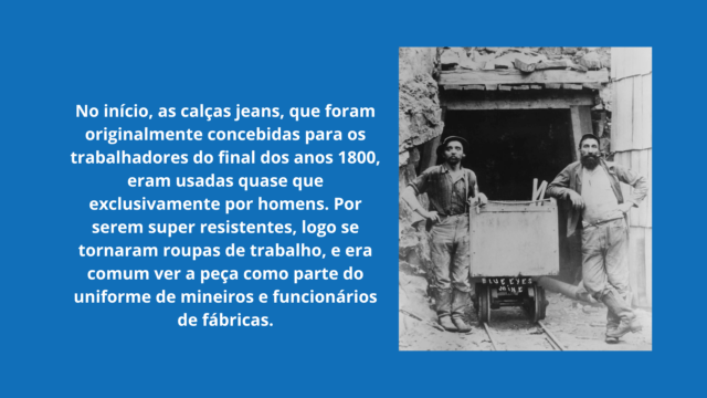 Desde então, a calça jeans ganhou espaço permanente no nosso guarda-roupas. E hoje transita bem do chão de fábrica às passarelas mais badaladas. Essa história ainda passa pelo cinema hollywoodiano até consagrar (e popularizar) um dos artigos mais emblemáticos da moda global. Sem dúvida, a calça jeans é um ícone.